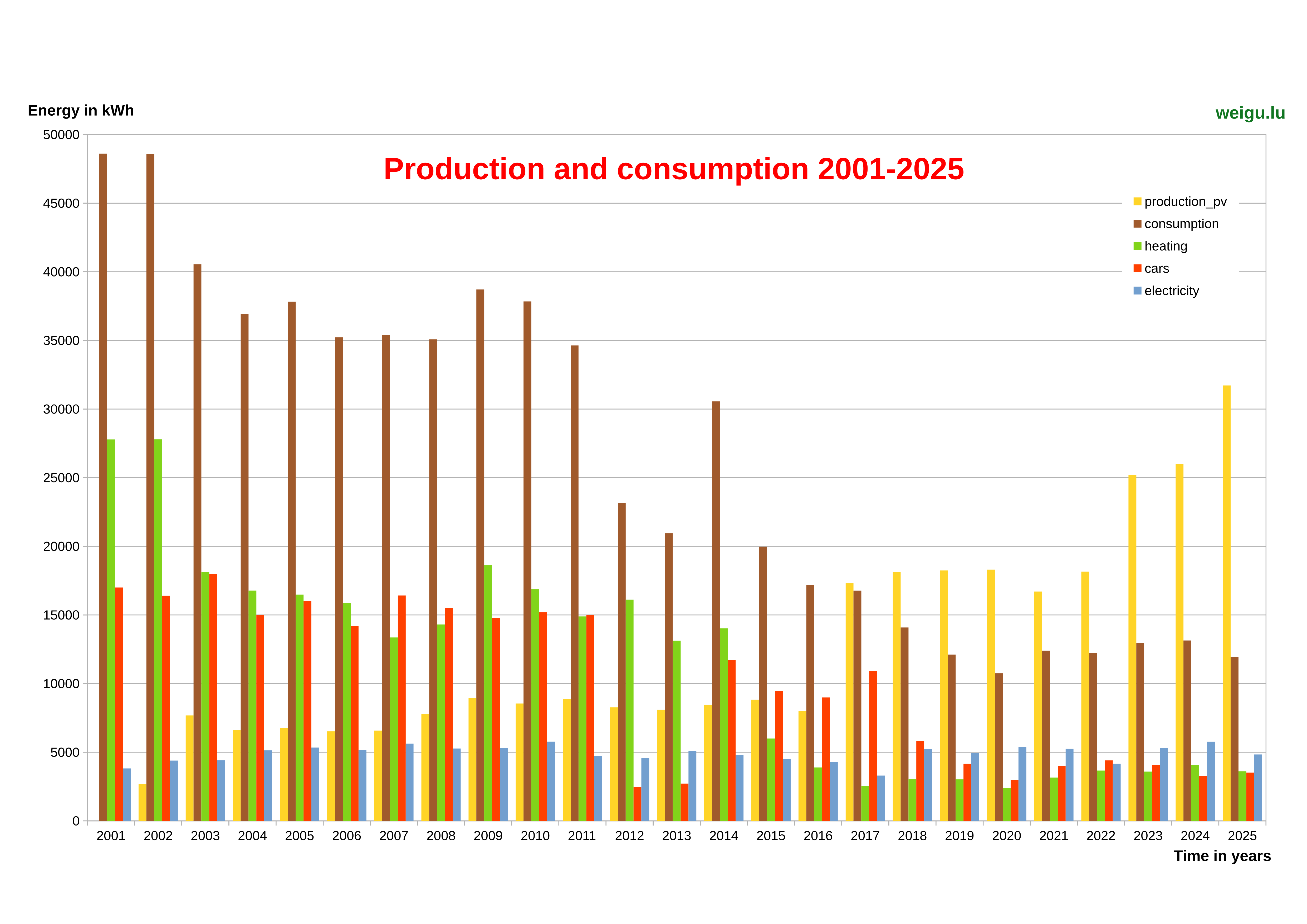 The following graph shows the consumption of a household starting in 2001. The house got isolated. The living space of the house (100m²) was also more than doubled (2002). The number of residents rose to 6, before declining again from 2022 onwards.